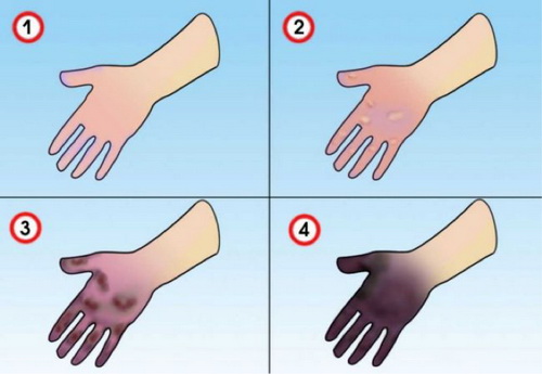 4-я степень – поражаются все слои мягких тканей, характеризуется ярко выраженным отеком, утратой чувствительности, часто заканчивается некрозом, омертвлением тканей, причина ампутации конечностей.